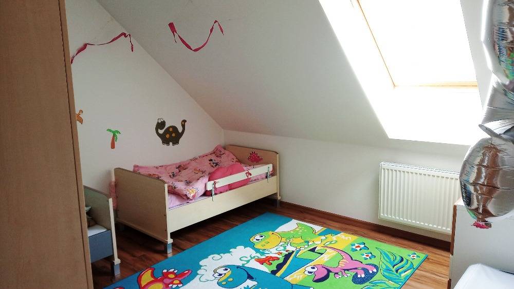 2. úroveň mezonetu: chodba, ložnice se střešním oknem, dětský pokoj s 2. střešními okny a vestavnými skříněmi, koupelna se sprchovým koutem, WC a umyvadlem.